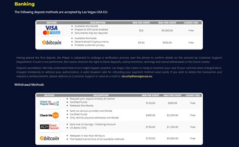 To withdraw money from Las Vegas USA casino you will be able to pick from any payment method you like. Now, I agree that the minimum withdrawal amount is a bit steep. However, you won’t have to cover any fees, which is definitely a big relief.