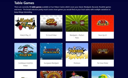 Another excellent opportunity to showcase Sun Palace Casino’s commitment to players is to take a look at the existing portfolio of table games. Often ignored by casinos, table games are very entertaining and Realtime Gaming has spent a lot of time developing excellent products.