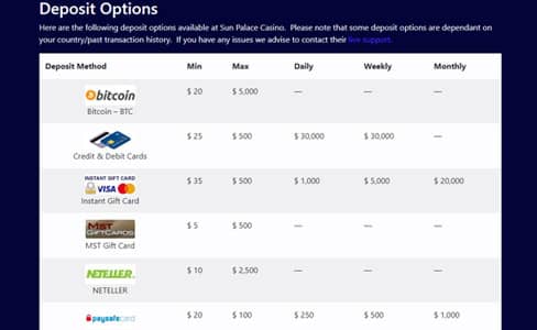 To withdraw from Sun Palace, you will once again have a selection of trusted payment methods. They offer decent limits as well as zero fees to make your withdrawing experience great: