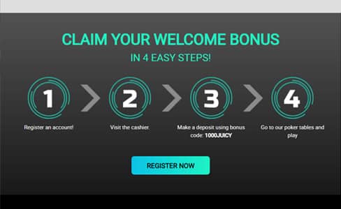 Is there a Juicy Stakes Poker welcome bonus code? Yes, to activate the bonus you will need to type in 100JUICY and make a minimum deposit worth $25.
