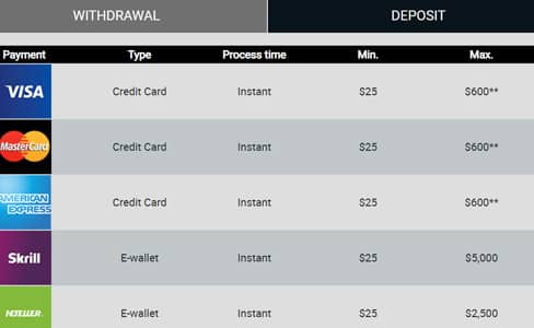 The minimum deposit is $25 and the maximum deposit $5,000. Withdrawals will vary based on the payment method you use. The minimum amount you can cash out is $25 via Skrill and Neteller.